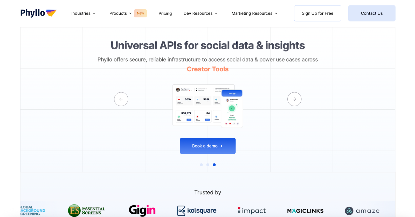 Phyllo is a creator data API that delivers and analyzes live data feeds from over 20 networks, including Instagram, YouTube, TikTok, and Twitch. It is widely used for influencer vetting, social screening, brand safety checks, and creator income evaluation, as well as for social KYC and visa vetting. The tool has a strong inclination toward influencer marketing channels and financial checks; less suitable for large-scale social data mining.