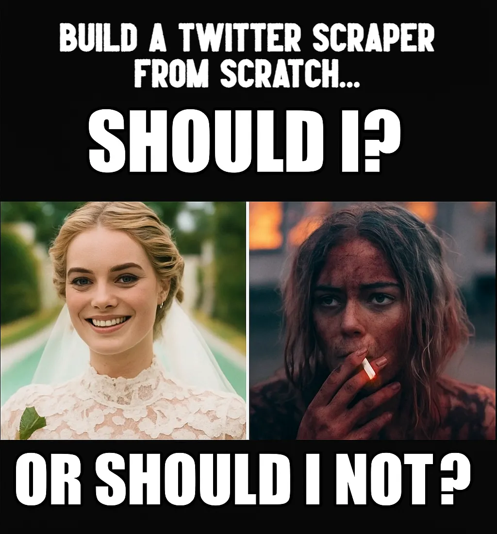 - Scraper (DIY code): a raw script you write or grab from GitHub that crawls Twitter pages. Maximum control, but also maximum headache, as it demands coding skills, constant maintenance, and can break easily.