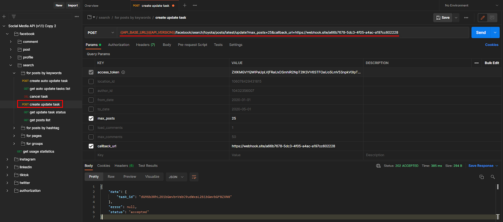 Como ejemplo, hagamos una solicitud para buscar las últimas 25 publicaciones en Facebook utilizando la palabra clave "toyota". También especificamos el enlace nº 2 en webhook.site en el parámetro callback_url.