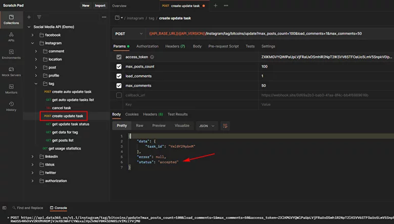 Solicitud POST es una tarea para actualizar datos, es decir, es una tarea para agregar nuevos datos de Instagram a la base de datos de Data365 o actualizar los datos existentes. La facturación se cobra por las solicitudes POST y se contabiliza en menciones.