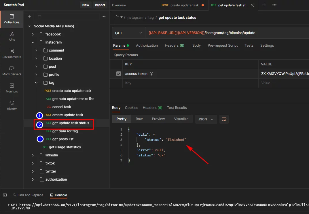 Cuando el estado de la solicitud del párrafo 2 sea "finalizado", necesitas enviar una solicitud GET para obtener datos sobre las publicaciones: