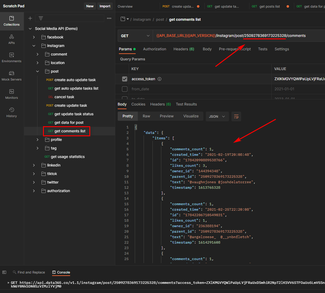 - 2509278369173225328 es la ID de la publicación que se descargó y sobre la que desea recibir comentarios.