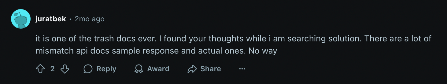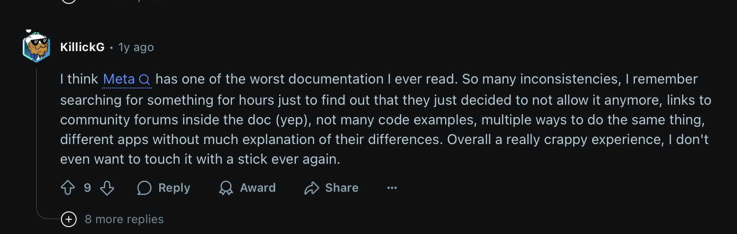De plus, les gens disent souvent que la documentation et le support de Meta sont incomplets et obsolètes, ce qui signifie que les équipes doivent passer plus de temps à résoudre les problèmes qu'à les développer. L'API elle-même est gratuite, mais les coûts indirects, tels que la nécessité de la maintenir en permanence, d'actualiser les jetons, de résoudre les problèmes de vérification commerciale et les fonctionnalités manquantes, en font un choix coûteux pour de nombreuses personnes.